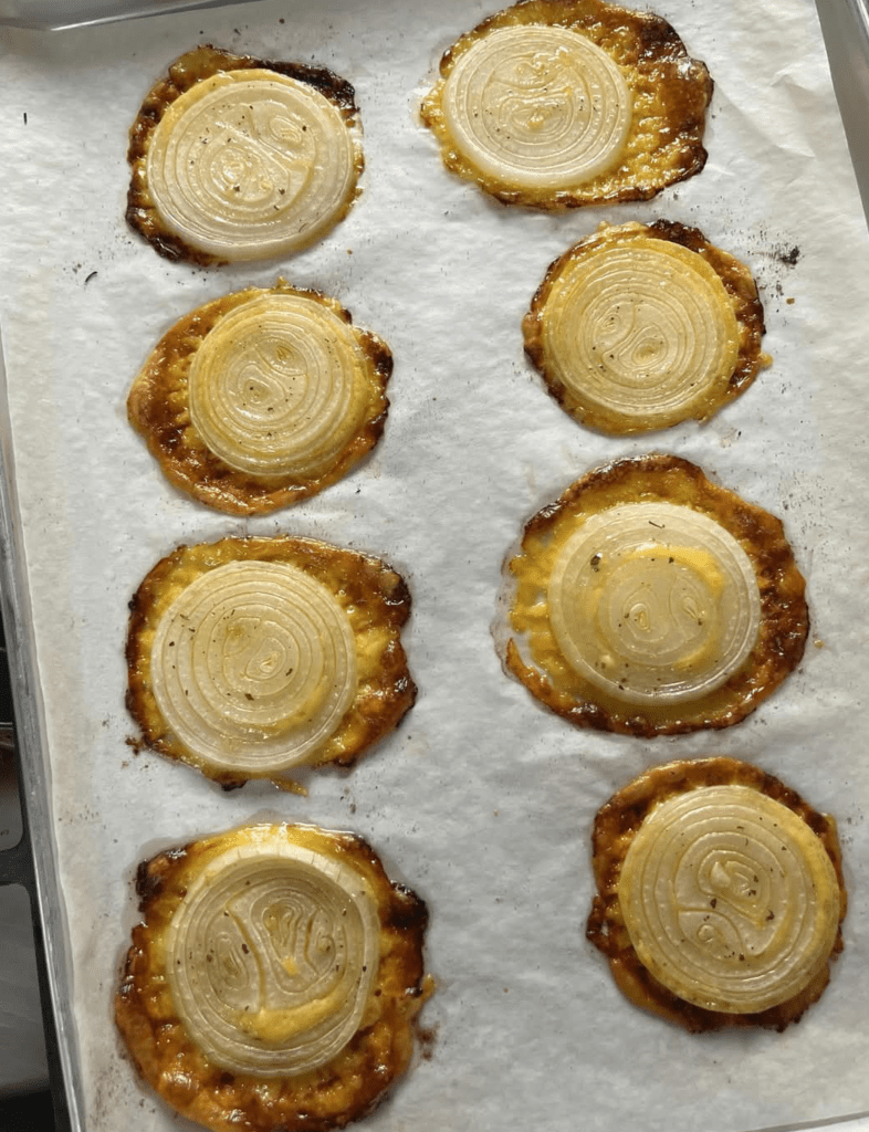 - Create cheese mounds on sheets, press onion rounds on top, and sprinkle with ranch seasoning.