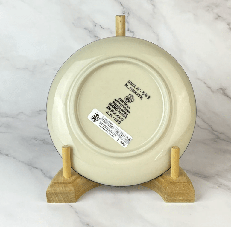 The UNIKAT-5163 plate is more than just a decorative item; it carries with it a story of Polish craftsmanship and tradition. The plate is marked with “HAND MADE IN POLAND,” a proud declaration of its origin and the hands that shaped it. The maker’s mark, “M.STARZYK,” signifies the artisan who brought this piece to life, adding a personal touch to the plate.