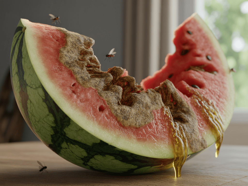 Improper storage can lead to fermentation, which causes a sour smell and fizzy texture. This makes the watermelon unsafe to eat.
